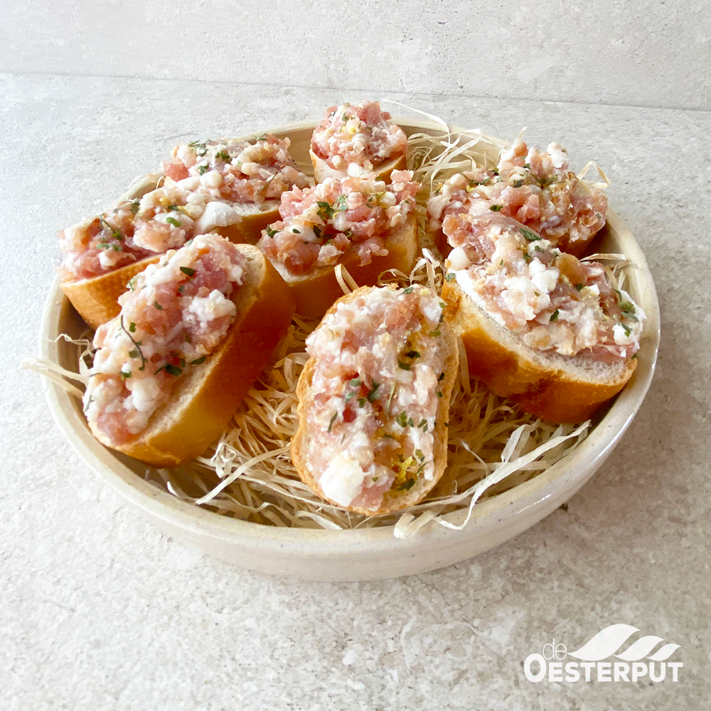 Deze bruschetta’s dienen per hoeveelheid van twee besteld te worden.